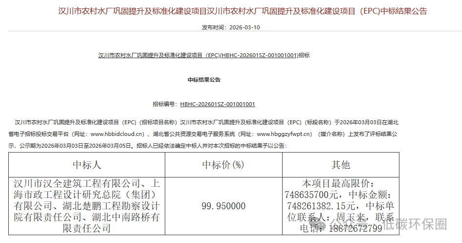 汉川市农村水厂巩固提升及标准化建设项目EPC中标 金额7.48亿元…